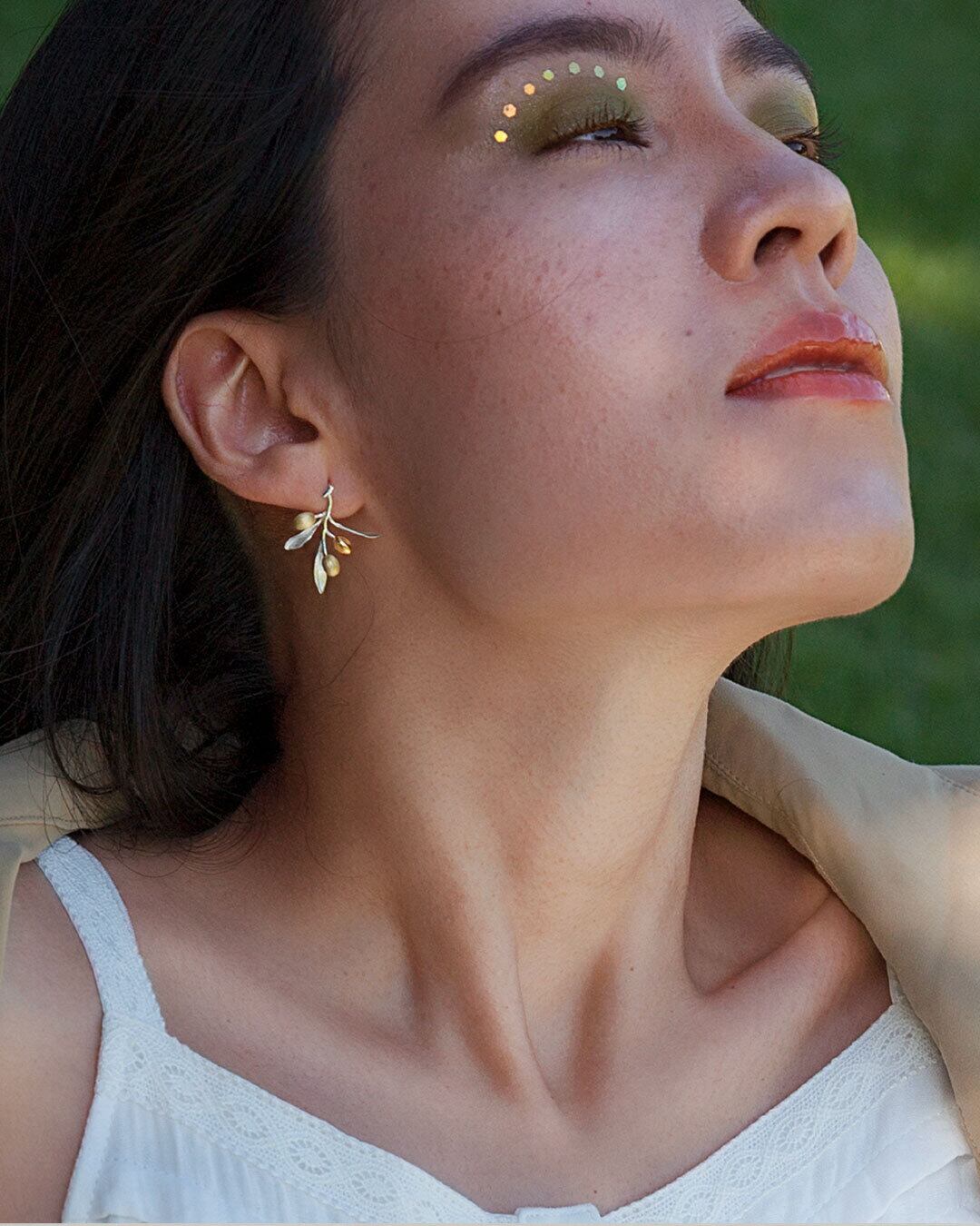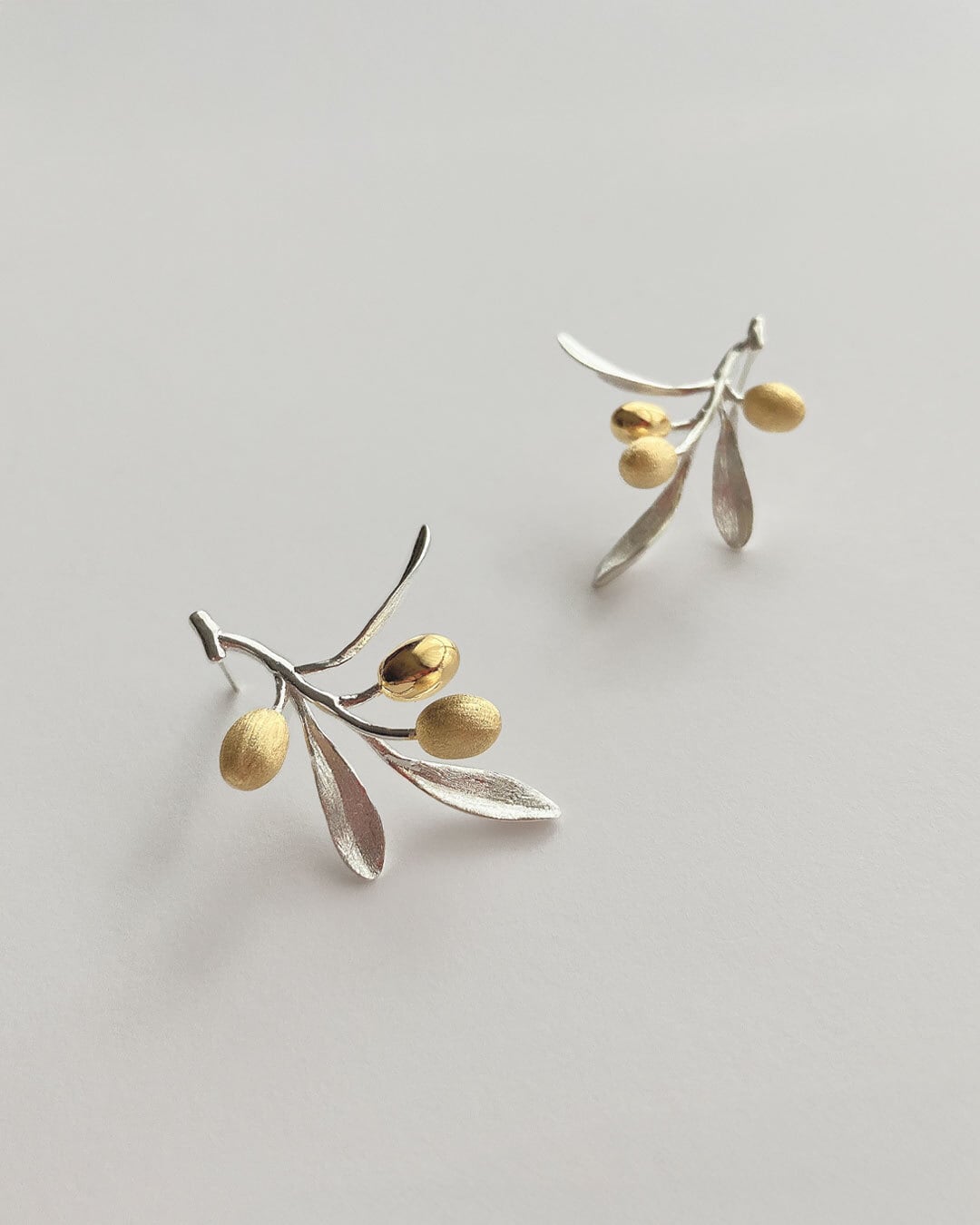 シルバーの葉と、ゴールドの実を組み合わせた、オリーブのピアスです。