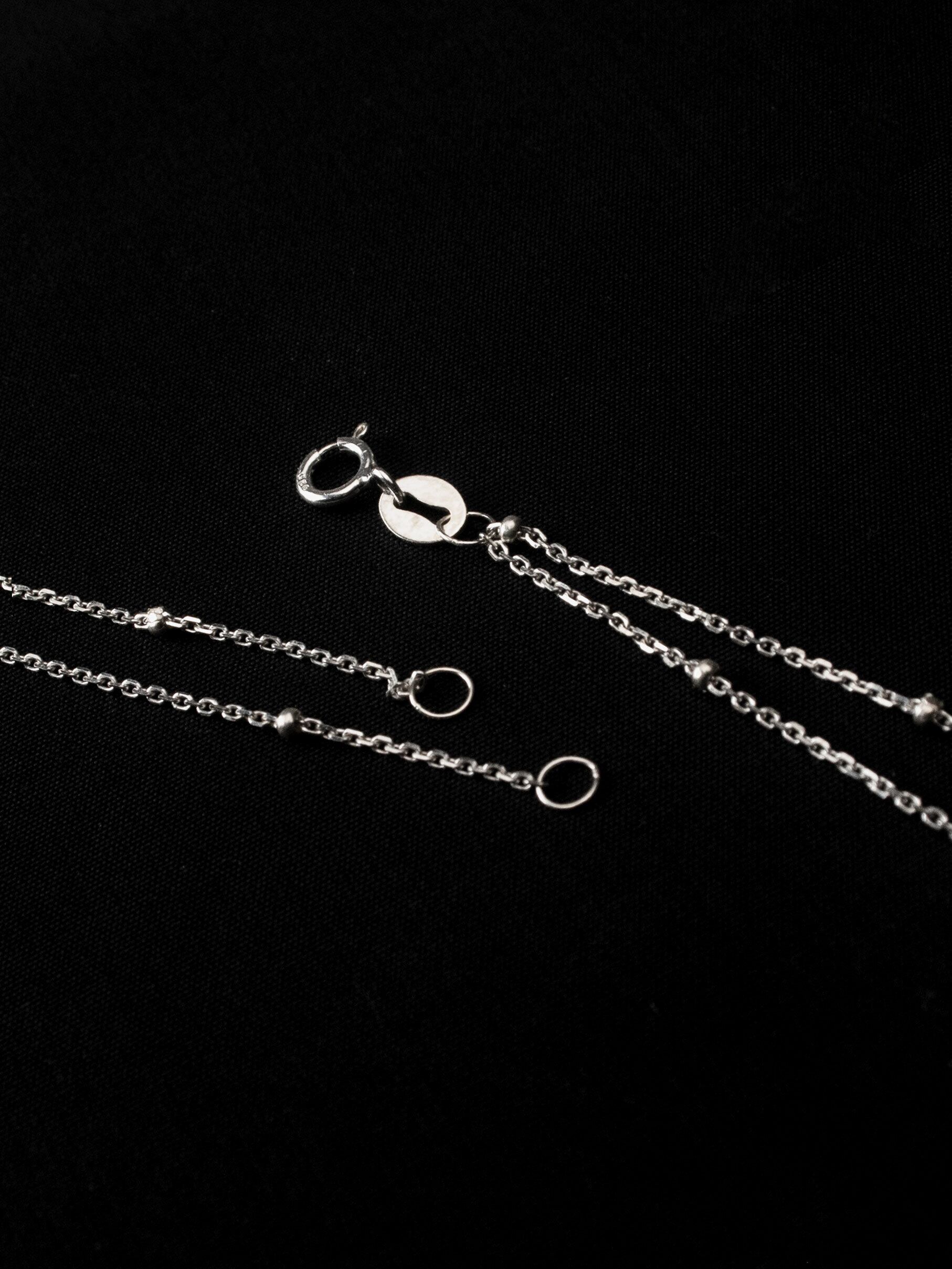 極細の1mmチェーンに、各25mmごとに小珠が付けられたデザインです。これにより、光は柔らかくなります。