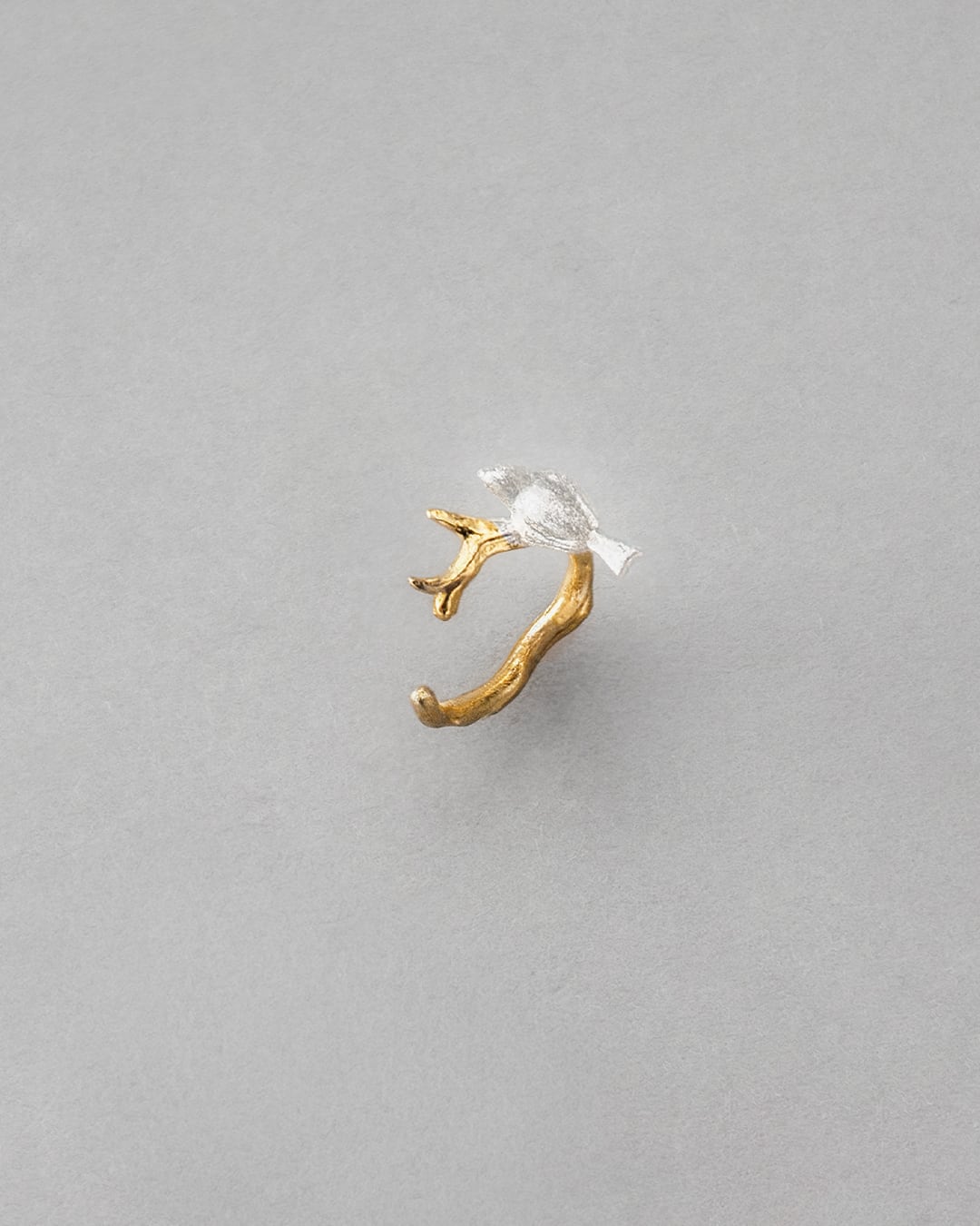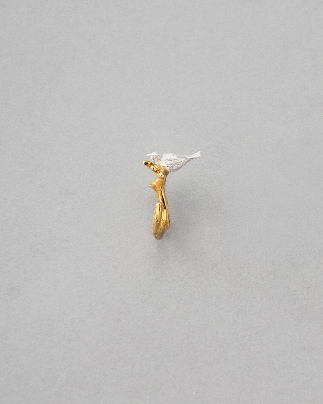 枝に止まる小鳥をモチーフに、シルバーとゴールドのコントラストが耳元を華やかに彩ります。ナチュラルなフォルムが柔らかさを演出しながらも、モダンなエッセンスを取り入れたデザインが特徴です。