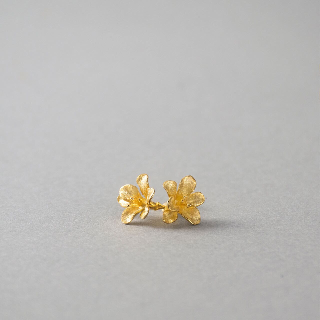 細やかに再現されたツイン・フリージアのデザインは、その繊細な花弁と独特な造形が際立ち、程良い存在感を放ちます。花蕊には18Kゴールドコーティングが施され、シルバーの花弁との間に美しいコントラストを生み出しています。このデザインはフリージアをテーマに、大人の洗練された可愛らしさを追求しています。