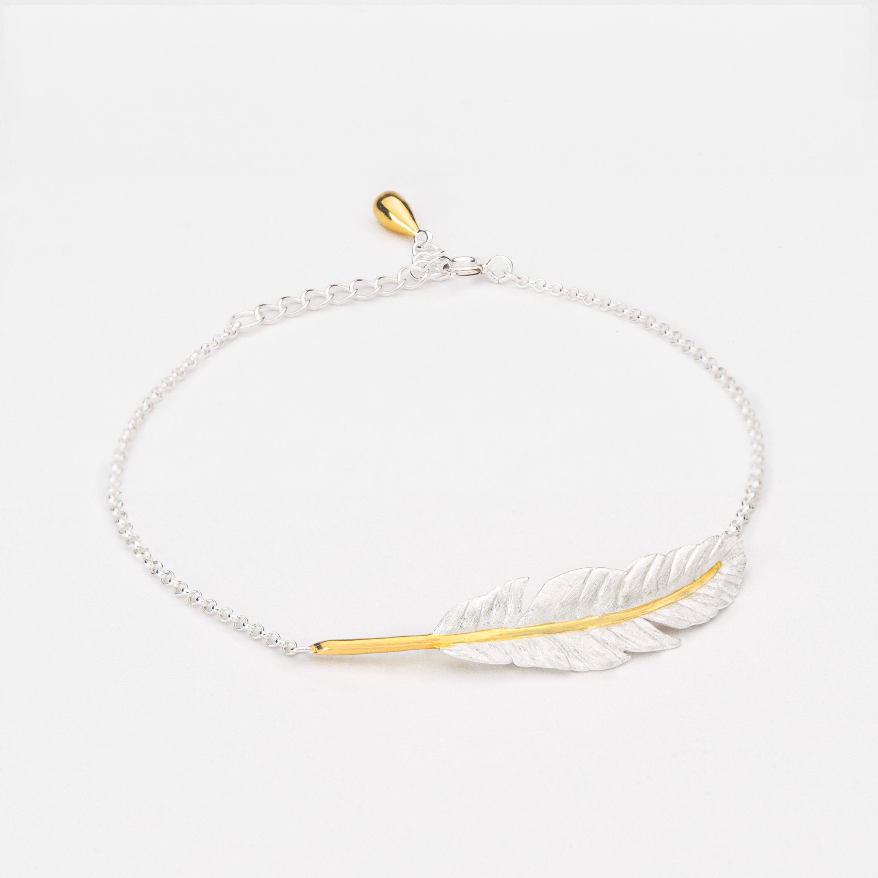 このブレスレットは細身のチェーンとシルバー・マット加工の小さな羽が特徴で、羽にはゴールドのラインが施されています。